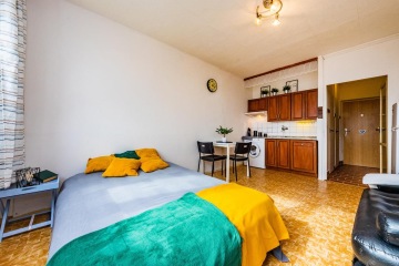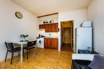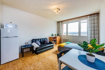 Nabízíme k prodeji světlý byt 1+kk (23,37 m²) se zděným jádrem, sklepem (1 m²) a pěkným výhledem v 5. patře revitalizovaného panelového domu s dvěma výtahy. Byt je v družstevním vlastnictví se splacenou anuitou. Velkou výhodou tohoto bytu jsou nízké náklady na bydlení 1557 Kč. Byt je vybaven kuchyňskou linkou, lednicí s mrazákem, pračkou. V koupelně je sprchový kout, WC samostatné. Úložné prostory jsou řešeny vestavnou skříní v předsíni. Byt má plastová okna a nové elektrické rozvody.