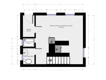 V 1.N.P. se nachází předsíň, obývací pokoj s kuchyňským koutem, sprchový kout a samostatné WC.