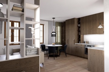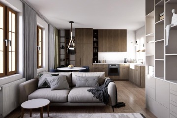 Bytová jednotka 1+kk s výměrou 41,3 m² se nachází ve 2.nadzemním podlaží, a je orientovaná do vnitrobloku. V bytě je k dispozici předsíň, obývací pokoj s kuchyňským koutem a koupelna s WC. Dále k bytu náleží sklep (3,3 m²) v 1. podzemním podlaží domu. Koupelna se sprchovým koutem bude mít keramické obklady do výšky stropu v odstínu šedý beton, dlažba na podlaze tmavý odstín betonu. Vytápění jednotky bude řešeno elektrokotlem Bosch s úsporným režimem, otopná tělesa plechová s termostatickou hlavicí budou zavěšena pod okny. Ohřev teplé vody zajistí nástěnný bojler v koupelně.