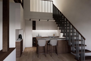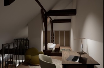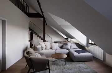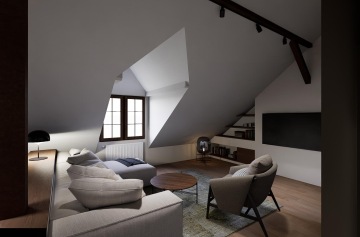 Bytová mezonetová jednotka 3+kk s výměrou 80,4m², s galerií, sklepem a parkovacím stáním se nachází ve 3. a 4. nadzemním podlaží, a je orientovaná směrem k náměstí. V bytě je k dispozici předsíň, obývací pokoj s kuchyňským koutem, ložnice, koupelna s WC, v patře se nachází další pokoj. Koupelna se sprchovým koutem bude mít keramické obklady do výšky stropu v odstínu šedý beton, dlažba na podlaze tmavý odstín betonu. Vytápění jednotky bude řešeno elektrokotlem Bosch s úsporným režimem, otopná tělesa s termostatickou hlavicí budou zavěšena pod okny. Ohřev teplé vody zajistí nástěnný bojler v koupelně.