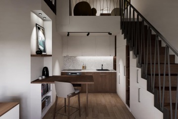 Bytová mezonetová jednotka 3+kk s výměrou 97,5 m² s galerií, sklepem 3,3 m² a parkovacím stáním se nachází ve 3. a 4. nadzemním podlaží, a je orientovaná směrem do vnitrobloku. V bytě je k dispozici předsíň, obývací pokoj s kuchyňským koutem, ložnice, koupelna s WC, v patře se nachází další pokoj. Koupelna se sprchovým koutem bude mít keramické obklady do výšky stropu v odstínu šedý beton, dlažba na podlaze tmavý odstín betonu. Vytápění jednotky bude řešeno elektrokotlem Bosch s úsporným režimem, otopná tělesa plechová s termostatickou hlavicí budou zavěšena pod okny. Ohřev teplé vody zajistí nástěnný bojler v koupelně.
